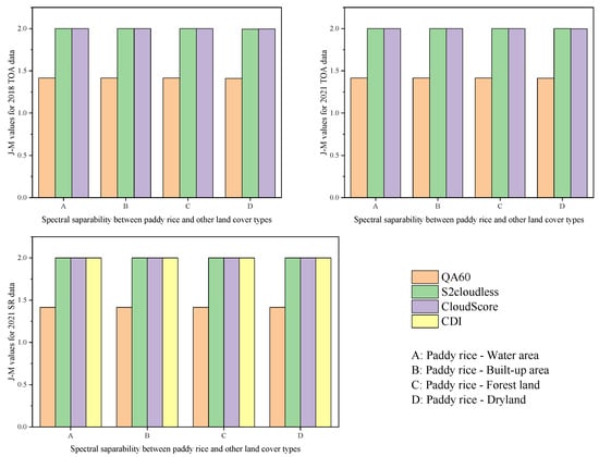 Figure 6 shows the values of J-M distances of samples between paddy rice and other land cover types (water area, built-up area, forest land, and dryland) in the cloud-free imagery by different cloud-mask algorithms. The J-M values were about 1.4 when the imagery was masked by QA60. For the other three cloud-mask algorithms, all of the J-M values were greater than 1.9 between paddy rice and other land cover, implying high spectral separability in this cloud-masked imagery. The J-M values show minor gaps across TOA products and SR products.