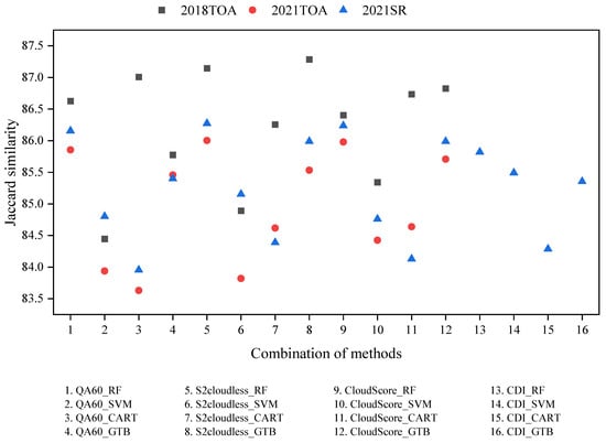 When comparing TOA products of 2018 with those of 2021 in the three tiles, S2cloudless and CloudScore algorithms have larger OAs in 2021 than those in 2018, while the facts of QA60 are just the opposite. When comparing TOA products with SR products in 2021, the differences in OA between TOA and SR are microscopic for QA60, S2cloudless, and CloudScore in the three tiles. Because of the specific tile, S2cloudless shows more overwhelming OAs than other algorithms in the RFP tile. Generally, the OAs from high to low are S2cloudless > CloudScore > QA60 for TOA products and S2cloudless > CloudScore > CDI > QA60 for SR products.