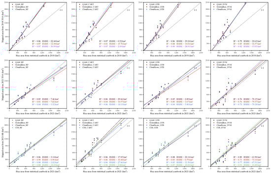 Rice-cropped areas derived from the statistical yearbook of the Hubei Province were compared with rice areas generated from our study in the JP based on a total of 16 counties. The statistical rice areas of the counties varied from 120.63 to 1261.11 km2 in 2018 and 179.88 to 1629.87 km2 in 2021. Generally, the mapped rice areas have high consistency with the county-level statistics. In the TOA products of 2018, the R2 of all the comparisons is greater than 0.8 except for the comparison of rice area mapped from the QA60_SVM algorithm and the statistical area, and the comparison from the algorithm of QA60_CART has the smallest RMSE at 0.52 km2. For the comparisons in the TOA products of 2021, rice areas mapped from SVM have comparatively smaller R2 (<0.8) and larger RMSE (>75 km2) than those from RF, CART, and GTB. While in the comparison of 2021 SR products, SVM integrated with S2cloudless or CloudScore still had a relatively low R2 (<0.8) and high RMSE (>65 km2), but showed a comparatively large R2 (>0.9) and smaller RMSE (<11 km2) when combined with the CDI algorithm (Figure 9).