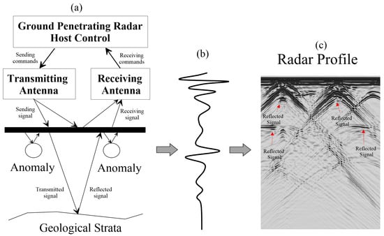 Ground-penetrating radar detection principle and data imaging schematic; the ground-penetrating radar working system (a) receives instructions and generates ground-penetrating radar 1D signals (b), which are then processed to produce ground-penetrating radar 2D images (c).