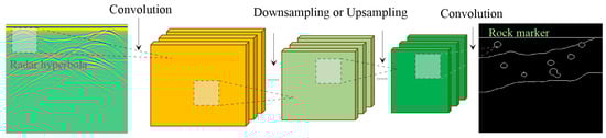 A convolutional neural network (CNN) is a specialized deep learning model tailored for image processing tasks. It excels in extracting features from input images and translating them into output images, a process essential for converting GPR B-scan images into rock structure label images, as shown in Figure 2 [24].