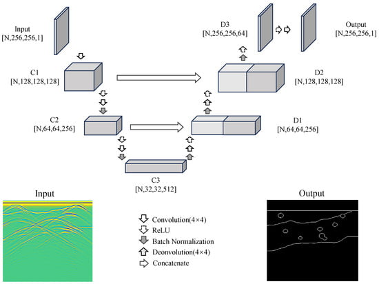 The UNet network, a convolutional neural network architecture designed for image segmentation, excels in feature extraction and processing [24]. This research, driven by a strong commitment to underground exploration and geological studies, utilizes the UNet network to automate the recognition of rock formations and stratigraphic labels in GPR B-scan images, as shown in Figure 3. This has significant strategic importance in accurately detecting subsurface structures and geological features. What sets our proposed UNet network apart is its unique architectural design, incorporating downsampling and upsampling operations along with skip connections. This design enables effective feature capture across a range of scales. For input data, we selected GPR B-scan images sized at 256 × 256 pixels. Using the UNet network, we generated rock and stratigraphic label images of the same dimensions, ensuring a comprehensive representation of subsurface structures. Additionally, a 3 × 3 convolutional kernel was skillfully utilized to extract localized features, allowing the UNet network to discern key elements, such as underground rock formations and stratigraphic layers, with precision.