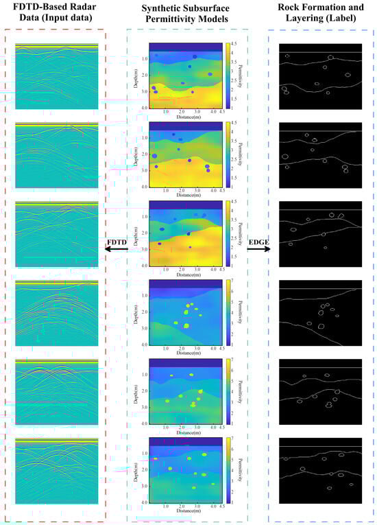 The importance of samples in deep learning lies in their role as the foundation for model training and performance evaluation. Sufficiently abundant and diverse samples help deep learning models better comprehend the complexity of a problem, enhancing their generalization capabilities. To simulate the complexity and diversity of underground rock formations and geological structures, we employ stratigraphy generation and rock mass modeling techniques to establish geological models. Subsequently, we utilize the FDTD algorithm to generate radar images, providing high-resolution underground structural data to accurately identify geological features [39,40].
