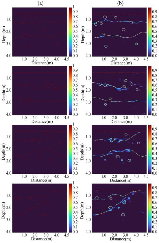 Figure 5 showcases four sets of deep learning predictions, revealing the results of predicting underground rock and stratigraphic structures using the UNet architecture for GPR data. By juxtaposing the predicted images on the left with the ground truth images on the right, we can thoroughly assess the model’s performance [46]. The deep neural network takes 12 h to train, yet its prediction speed is less than 1 s. Therefore, once the training is complete, the network model can be deployed immediately.