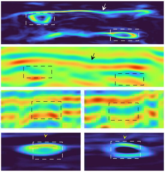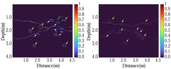 Displayed in Figure 6, these two images depict the prediction outcomes following the processing of GPR data using the deep learning model UNet, accompanied by a comparative overlay with the ground truth. Within each image, the anticipated signals related to subterranean rock and stratigraphic structures are conveyed through varying color intensities, symbolizing the likelihood of their presence. Concurrently, actual rock and stratigraphic structures are superimposed in a semi-transparent layer atop the prediction results. By scrutinizing the accuracy of predictions and identifying discrepancies (where yellow arrows denote correct predictions and white arrows pinpoint inaccuracies), we can evaluate the model’s performance.
