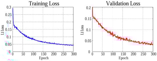 The right image presents the loss function on the validation set. Similarly, the loss function diminishes as the number of epochs increases, a positive indication that the model generalizes effectively to previously unseen data. The decreasing trend in validation loss remains relatively stable in comparison to the training loss, without any noticeable upward trends, implying the absence of overfitting and affirming the model’s strong generalization capabilities [47].