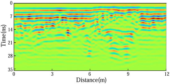 Figure 8 displays a measured GPR data image. In the image, radar signals are represented in color, where different colors indicate varying signal strengths. The time depth is 35 nanoseconds (ns), and the survey length is approximately 16 m. Radar data are typically used to analyze subsurface structural features, such as rock layers, voids, or other obstacles.