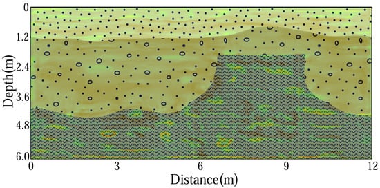 These equations describe the application of PML boundary conditions in two dimensions and cover the electric fields and as well as the magnetic field . Here, i and j represent coordinates in a two-dimensional grid, is the time step, represents the relative permittivity of the material, and and are the spatial step sizes. In this section, we will discuss our methodology, which combines various techniques, including random stratigraphic variation, rock mass generation, stochastic media modeling, and FDTD methods. This approach allows us to create a multitude of irregular dielectric constant sample models and their corresponding radar data. The electrical models derived from these data provide crucial insights into rock formations and stratigraphic structures, as vividly demonstrated in Figure 4.