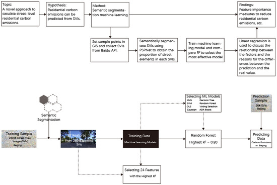 The framework consists of six steps (see Figure 2). First, remote-sensing CE data were provided by Planet Data Tech (Suzhou) Ltd., a car-bon data platform company based on satellite quantitative remote sensing fusion algorithm and high-quality environmental data model, with a 1 km level data grid. Second, the SVIs were obtained, using Baidu Open Platform API (https://lbsyun.baidu.com/, accessed on 1 May 2022) in Python 3.8 through the coordinates of the selected points along the road network in Beijing at a 250 m interval. For each sampling coordinate, we obtained the 360-degree-view SVI. Third, PSPNet, a semantic segmentation model, was used to extract the proportion of various street elements from each SVI. The most ubiquitous visual elements related to CEs suggested by the literature, including the surface, sidewalk, greenery, sky, road, building, wall, fence, and seat, were selected. Fourth, training of ML models was performed to predict CEs using visual features extracted in Python. The goodness of fit (R2) was chosen as the criterion to select the most accurate models from the four ML models (i.e., KNN, SVM, random forest, and decision trees). Last, we used the trained ML model to predict the residential CEs in Beijing, visualizing the gaps between the ground-truth CE and our best prediction to validate our model and understand the potential causes of the biases based on the impact ranking and feature importance.