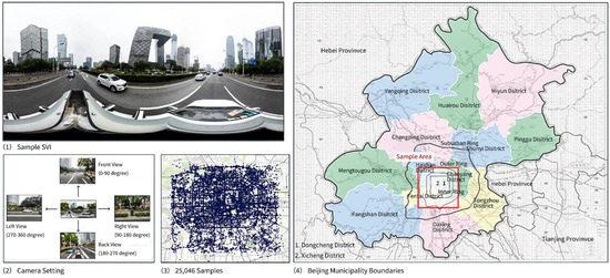 Baidu Street View images represent the most significant data source available for use in studying urban streets. Several different angles of street view images are available using Baidu Maps, which is one of the largest online map providers in China. Since Google Maps is unavailable in China, Baidu Maps is an excellent choice with relatively high quality. This study downloaded Baidu Street View (BSV) imagery using the BSV API (http://api.map.baidu.com/panorama/v2, accessed on 1 May 2022)). We set the sampling point to capture street view images in four radial directions at a fixed height, giving a total of 25,046 street view images (Figure 4) based on our sampling points every 250 m along the road networks. Each image had a resolution of 512 × 512 pixels and was in JPG format, making them a reliable source for our research. Note that (by checking the time data) all SVI samples were taken during 2019–2021, being the most up-to-date dataset that is available to match the period of our CE data. We looked through the street view history in Baidu Maps, which makes it possible for users to see how a place has changed over the years and help identify changes in the physical environment. There were few major construction projects in the study area during this period. Considering that the street environment is rather stable in the short term [131], we were able to assume no significant changes happened during the sample period (2019–2021). Notably, the SVI retrieval process is also consistent with all parameters, including the heading, the position coordinates (longitude and latitude), the image resolution (width and height), the horizontal field, and the pitch.