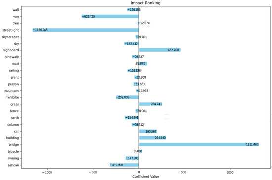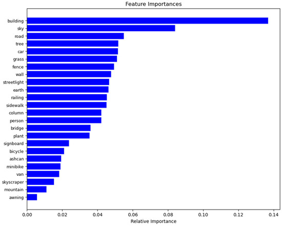 The impact factor (IF) and feature importance (FI) analysis revealed a big divergence regarding what visual features are significant in predicting the CEs. On the one hand, the IF ranking (based on linear regression coefficients) indicates that bridge, streetlight, van, signboard, ashcan, building, grass, minibike, car, sky, and earth were the most impactful (Figure 7). On the other hand, the FI analysis highlights divergent visual elements as more effective when using tree-based ML models (Figure 8). The top 10 features regarding FI are building, sky, road, tree, car, grass, fence, wall, streetlight, and earth. Given that the OLS has a significantly poorer performance (Table 2), the relationship between visual features and the CEs is more likely to be non-linear. The FI analysis is more reliable.