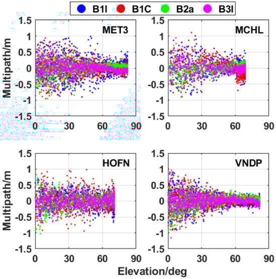 Table 4. The table shows that the mean multipath for each station is close to 0 m. In terms of STD, the B3I signal exhibits the least multipath, approximately 0.17 m, and the value of B2a signal is close to B3I. The B1I signal has the most significant multipath, which is about 0.26 m.