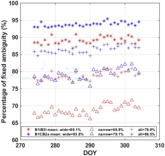 Figure 4 presents the percentage of successfully resolved WL ambiguity and NL ambiguity using BDS-3 B1I/B3I and B1C/B2a combination. The figure indicates that the B1C/B2a achieves a higher percentage of ambiguity fixing compared with the B1I/B3I combination. In detail, the average percentage of fixed WL ambiguities is 89.1% for the B1I/B3I combination and increases to 93.8% for the B1C/B2a solutions. In the case of NL ambiguities, the mean percentage of fixed ambiguities is 68.8% for B1I/B3I and is notably higher at 79.1% for the B1C/B2a combination. Considering all the fixed ambiguities, including both WL and NL, the mean percentage is 78.9% for the B1I/B3I combination, while the B1C/B2a combination demonstrates a 7.6% improvement with a mean percentage of fixed ambiguities.
