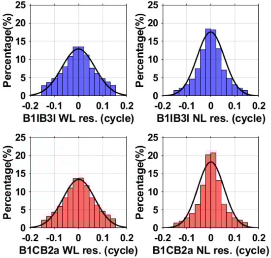 In addition, we conducted a comparison of the residual distributions for WL ambiguity and NL ambiguity between B1I/B3I and B1C/B2a combinations, as illustrated in