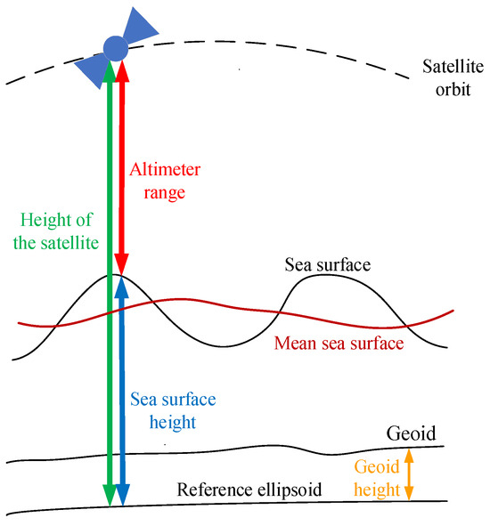 The radar of the satellite altimeter operates by measuring the time for signals to propagate between the satellite’s elevation and the surface of the sea. The difference and the SA altitude measured above a specified reference surface and the altimetric range result in the determination of SSH, as depicted in Figure 1. The discrepancy between the sea level and reference ellipsoid is illustrated in Figure 1 [19,20].
