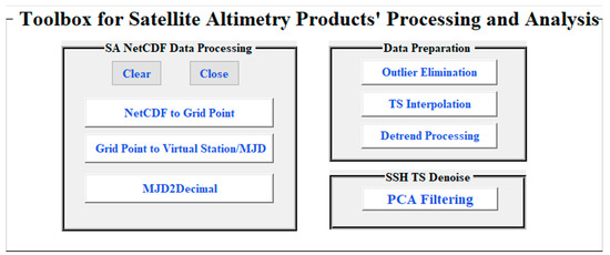 In the realm of processing raw SA ocean reanalysis product in NetCDF format [38], we created the Satellite Altimetry Toolbox (SA_Tool V1.0). Accessible at https://www.kaggle.com/datasets/spacegeodesy/sa-tool-v1-0-for-sa-on-sea-level-rise-estimation (accessed on 10 April 2023), this MATLAB GUI-based toolkit facilitates the processing and analysis of SA data. As illustrated in Figure 3, SA_Tool V1.0 encompasses three pivotal modules: the SA NetCDF to grid point module, the Data Preparation module, and the SSH TS Denoise module. SA_Tool V1.0 offers versatile functionalities, including reading raw NetCDF-format SA observations, generating SSH time series at specified points given their latitude and longitude, outlier detection using 3IQR, interpolation of SSH time series, and applying PCA filtering to the SSH time series. SA_Tool’s modules operate independently, allowing users to execute each model separately. Simultaneously, a well-defined interconnection exists between the modules, enabling the output of one module to serve as input data for another. The seamless integration and synergy between these modules create comprehensive time series processing and analysis software. The “Trend Analysis on SSH Time Series with PCA” section delves into the mathematical models and fundamental functions of each module, offering in-depth insights into the toolkit’s capabilities.