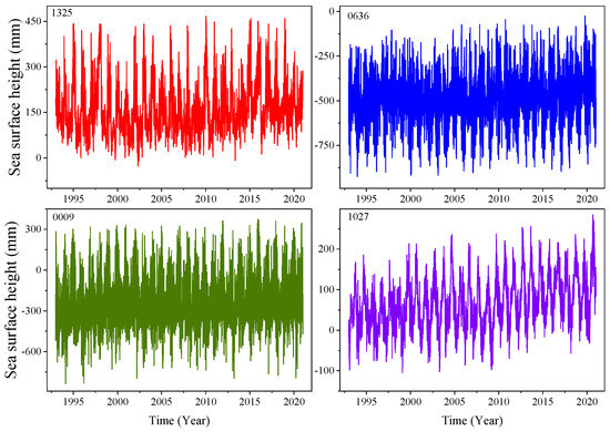 For the stochastic noise property analysis of the SSH time series, we analyzed 184 SA virtual coastal stations (Figure 2) using the stochastic models described in the previous section. Figure 4 displays examples of the SSH time series of the 0009 (NLD), 0636 (USA), 1027 (JPN), and 1325 (CAN) sites. The SSH time series exhibit significant seasonal fluctuations (e.g., 1027 and 1325 show an obvious sinusoidal signal) and an envelope corresponding to slow variations. In addition, slight differences in the periodic signal changes (e.g., amplitude of the seasonal signal) of the four listed sites are visible in Figure 4, highlighting regional differences in the SSH time series.