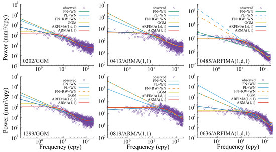 Previous studies have pointed out that a geometric time series can be modeled with correlated (also called colored) noise, and that different stochastic models have a significant impact on velocity parameter estimation for GNSS displacement time series [23,24,32,38]. To explore the optimal noise model of the SSH time series and the related impact, we used the ARMA (p, q), ARFIMA (p, d, q), GGM, FNWN, PLWN, and RWFNWN stochastic models to fit the SSH time series. We estimated the time-varying seasonal signal using the software Hector V2.1 based on maximum likelihood estimation as described in Bennett (2008) and Bos et al. (2013) [12,28]. Figure 5 shows the PSD of SSH residuals when various stochastic models were considered during the estimation. The stochastic models FNWN/RWFNWN/PLWN exhibit a poorer fit to the SSH time series, whereas the GGM, ARMA (1, 1), and ARFIMA (1, d, 1) models demonstrate a better result for the SSH time series of SA virtual coastal stations 0202/1299, 0819/0413, and 0485/0636, respectively.