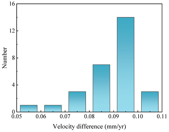 After removing common mode noise through PCA, the RMS of 96.7% of the SSH times series decreases by an average of 8.47 mm, and the average correlation coefficient of the SSH times series before and after noise reduction is 0.86. In addition, after PCA noise reduction, about 51.6% of the SSH time series’ optimal noise model changes. We then used the optimal noise models to compare the velocity parameters before and after applying the PCA method. Table 2 provides the distribution of variations in the velocity parameters after PCA noise reduction. The results show that PCA preserves the velocity of the original SSH time series, while the velocity uncertainty’s accuracy improves after PCA denoising (about 59.3% of virtual coastal stations’ velocity uncertainty is reduced). It should be mentioned that our stations were not chosen to provide the most favorable results, so this result highlights the importance of PCA denoising to improve SLR retrieval (both parameters and uncertainty).
