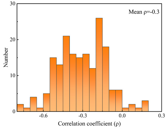 We further investigated the impact of geophysical fluid loadings through a reduction in the raw SSH time series. Figure 8 shows the statistical distribution of the correlation coefficients of the analyzed SSH time series with respect to the geophysical loading products’ time series, i.e., the four combined loading-induced height time series. Figure 8 highlights that the mean value of the correlation coefficients for the 184 virtual stations is −0.30, and the maximum and minimum values of the correlation coefficient are 0.20 and −0.78, respectively. Most virtual stations show a negative correlation and the correlation coefficient is small. Furthermore, after loading correction, about 88.0% of the selected optimal noise model remains unchanged.