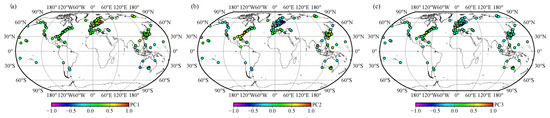 (a–c)Spatial responses of top 3 PCs of virtual coastal satellite altimetry stations.