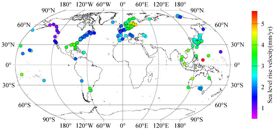 The spatial distribution of the velocity of the SLR change for the 184 virtual coastal stations analyzed, with data spanning the period from 1993 to 2020.