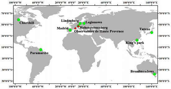 Ground-based measurements can provide precise data for in situ ozone profiles. The balloon-borne ozonesonde can obtain the ozone profile from the troposphere to the lower stratosphere. The measurement precision of this instrument is 3–5%, and the accuracy is 5–10% [42,43]. The ozone lidar can obtain the ozone profile in the upper stratosphere specifically. The estimated accuracy of data obtained by this instrument between 15 and 50 km is 5% [44]. The ozonesonde and ozone lidar data have been used to validate the data produced by satellites due to the superior performance of the former [6,18,19,45,46,47,48]. The locations of stations are shown in Figure 1, and basic information regarding them is listed in Table 2.