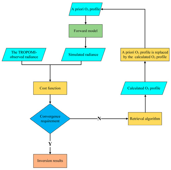 The retrieval algorithm of ozone profile in this paper was based on the principle of the optimal estimation method [49]. The difference between the simulated and measured radiances and between the a priori value and state vector can be minimized at the same time during the iterations [50,51]. The measurement error covariance matrix and the a priori error covariance were used to constrain the state vector . The entire flowchart of the retrieval algorithm is shown in Figure 2.