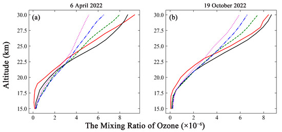 Comparison of ozonesonde measurements with a simulated ozone profile for different processing methods. The red solid line represents the ground-based measurements. The black solid line represents the simulation results for same-day measurements. The green dashed line represents the simulation results obtained by weekly mean methods. The blue dash-dotted line represents the simulation results obtained by half-monthly mean methods. The magenta dotted line represents simulation results obtained by the monthly mean method. (a) The comparison from 6 April 2022. (b) The comparison from 19 October 2022.