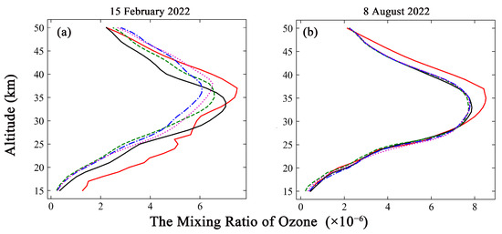 Same as Figure 3 but for comparison of ozone lidar measurements with simulated ozone profile for different processing methods. The red solid line represents the ground-based measurements. The black solid line represents the simulation results for same-day measurements. The green dashed line represents the simulation results obtained by weekly mean methods. The blue dash-dotted line represents the simulation results obtained by half-monthly mean methods. The magenta dotted line represents simulation results obtained by the monthly mean method. (a) The comparison at the 15 February 2022. (b) The comparison at the 8 August 2022.