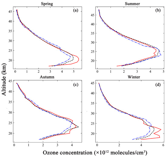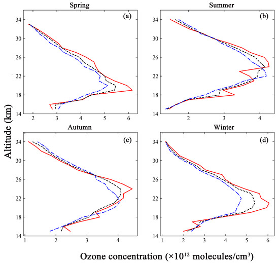 Similar to Figure 5 but showing the comparison of the inversion results with ozone lidar measurements (red solid line). The black dashed line represents the inversion results based on GEOS-Chem. The blue dotted line represents the inversion results based on TpO3 climatology. (a) The comparison in spring. (b) The comparison in summer. (c) The comparison in autumn. (d) The comparison in winter.