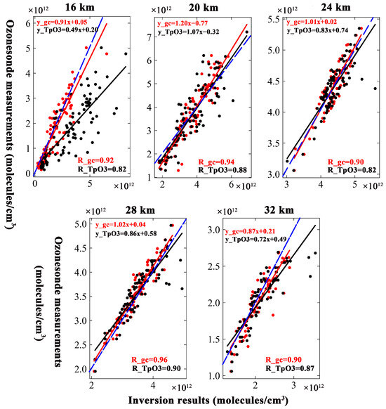 Figure 6 illustrates the comparisons and fitting of inversion results of different a priori ozone profiles and ozonesonde measurements at different altitudes using scatterplots and best-fir lines. The value of R was also computed.