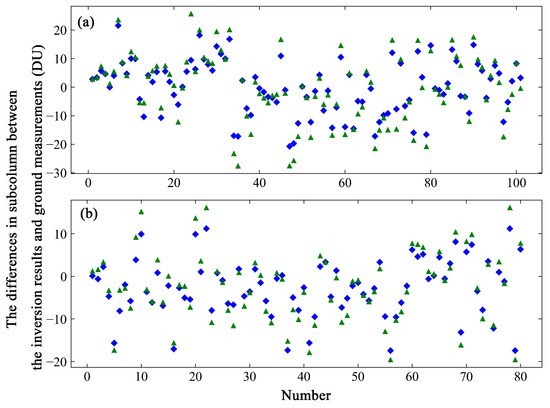 The scatterplot shows the differences in value in the subcolumns between the inversion results based on different a priori ozone profiles and the ozonesonde measurements. The green triangles represent the values of the inversion results based on TpO3 climatology, and the blue rhombuses those based on the GEOS-Chem data. (a) The values of the differences in the subcolumn at 16–24 km. (b) The values of the differences in the subcolumn at 24–32 km.