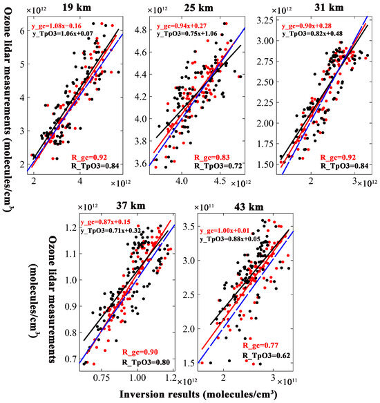 Figure 9 illustrates the same comparisons and fitting of inversion results, but for ozone lidar measurements at different altitudes.
