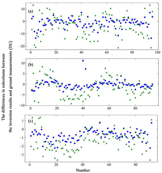 Same as Figure 7 but showing a comparison of the inversion results with the ozone lidar measurements. The green triangles represent the values of the inversion results based on TpO3 climatology, and the blue rhombuses those based on the GEOS-Chem data. (a) The values of the difference in the subcolumn at 20–28 km. (b) The values of the difference in the subcolumn at 28–36 km. (c) The values of the difference in the subcolumn at 36–44 km.