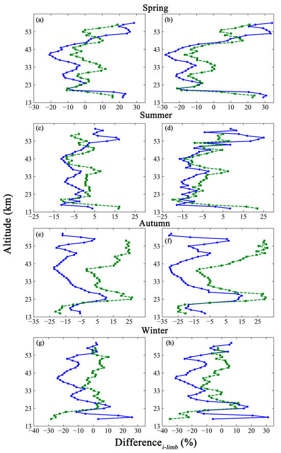 The two types of inversion results were individually compared with the Level 2 products of MLS and OMPS_LP. Validations were performed for the overlapping altitudes due to the different effective altitudes of the Level 2 products. The relative deviations of limb are shown in Figure 11.