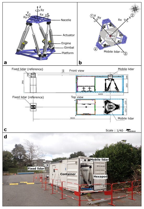 The two lidars were positioned approximately 10 m apart from each other. To ensure their protection, the mobile lidar and the hexapod were housed inside a container (Figure 1d). The hexapod and its connector are sensitive to humidity and therefore cannot be operated during rainy conditions.