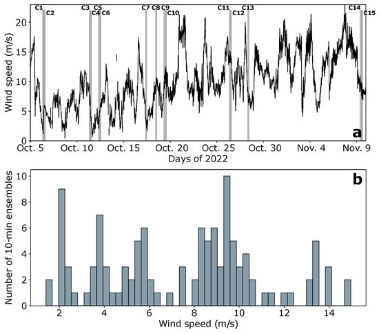 (a) 10 min averaged wind speed measured by the fixed lidar. The gray areas indicate the time periods of data acquisition by the mobile lidar. (b) Wind speed distribution recorded by the fixed lidar during the data acquisition periods of the mobile lidar. Wind statistics presented in each panel were obtained at a measurement altitude of 140 m.