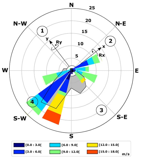 Wind rose (color-coded) depicting the results of the 15 measurement cycles conducted using the 9 sequences at 10 different heights. The gray shading with black contour represents the 10 min mean wind direction at 140 m, as recorded by the fixed lidar over the course of the 57-day deployment. The numbers 1 to 5 indicate the orientation of the lidar’s five beams. The x and y axes of the hexapod, corresponding to rotations Rx and Ry, respectively, are also displayed.