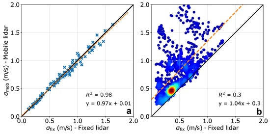 (a) Comparison of the standard deviation () of the LOS velocity measured by beam 1 at all measurement heights for both fixed and mobile lidars during 2 h where the mobile lidar remained stationary. (b) Similar to (a) but with the mobile lidar in motion. In this panel, the results are obtained from the 9 sequences used in the 15 measurement cycles. The color-coded in (b) is based on point density. For both panels, the solid black line represents 1:1 line. The orange dashed line represents the best fit for the scatter plot.