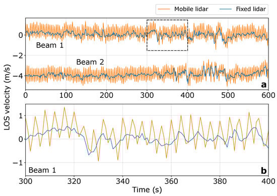 (a)—LOS velocity time series measured by beam 1 and beam 2 of the mobile (orange) and fixed (blue) lidars at a measurement altitude of 140 m during the first sequence of cycle 13. (b)—Zoom on 100 s, indicated by the black dashed rectangle in (a), of the time series of LOS velocities measured by beam 1 from both lidars.