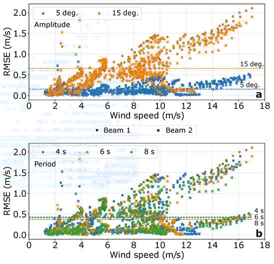 In Figure 6a, it is evident that higher amplitudes correspond to increased RMSE values for a given period. At a lower amplitude (5 deg.), the mean RMSE associated with beam 1 is 0.15 m/s. However, with an amplitude three times higher, the mean RMSE increases to more than four times higher (0.65 m/s). At the lowest amplitude, the RMSE associated with beam 1 reaches 0.5 m/s at higher wind speeds, while for the highest amplitude, it reaches 2 m/s. Although the RMSE values associated with beam 1 and beam 2 are similar at the lowest amplitude, the gap between the RMSE values derived from both beams slightly widens at higher wind speeds. Conversely, at the highest amplitude, the RMSE associated with beam 1 is consistently higher than that associated with beam 2.