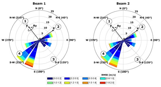 Wind rose depicting the RMSE of LOS velocity fluctuations measured by beam 1 and beam 2 at all measurement heights. These results are derived from the initial 6 sequences (single rotations around the y-axis) of the 15 measurement cycles. The four numbers displayed correspond to the orientation of the lidar’s first four beams. Additionally, the two arrows, labeled x and y, represent the orientation of the hexapod.