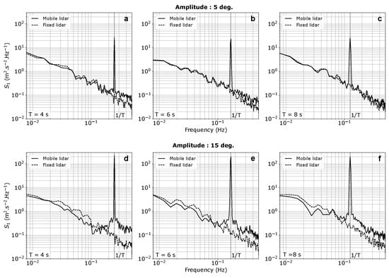 Mean spectrum, averaged over 15 cycles and measured at 140 m above the ground by beam 1 of the mobile (solid line) and fixed (dashed line) lidars. The upper panels (a–c) show the spectra measured during sequences 1, 3, and 5, corresponding to motion periods of 4 s, 6 s, and 8 s with an amplitude of 5 deg., respectively. The lower panels (d–f) show the spectra measured during sequences 2, 4, and 6, corresponding to motion periods of 4 s, 6 s, and 8 s with an amplitude of 15 deg., respectively. Vertical lines represent the frequencies associated with the period, , of the motion indicated in the bottom left corner of each panel.