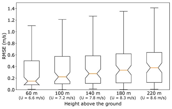 Figure 9 illustrates a significant trend: the RMSE shows an upward trend as the measurement height increases. Notably, at an altitude of 220 m, the median RMSE exceeds the median value of 0.15 m/s computed at 60 m by more than 2.5 times. This observation aligns with the expected outcome, as previous findings in this study have demonstrated that higher wind speeds lead to higher RMSE in velocity fluctuations.