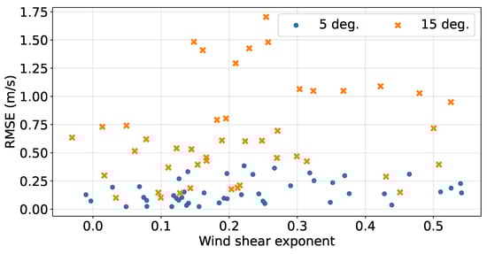 Height-averaged RMSE of the LOS velocity fluctuations plotted against the wind shear exponent, based on measurements from the first 6 sequences (single rotations around the y-axis) of the 15 cycles. The data is differentiated for motion associated with 5 deg. (blue dots) and 15 deg. (orange crosses) amplitude.