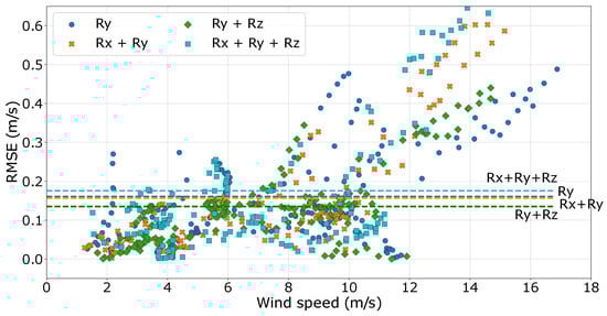 Moreover, Figure 12b,d shows that rotations Rx/Ry and Rx/Ry/Rz did not exhibit a consistent pattern, possibly due to variations in the phase of these coupled motions. When the wind aligns with either the x-axis or the y-axis, it can generate both high and low RMSE values. These findings suggest the potential significance of considering the phase of rotational motions in the context of turbulence analysis and LOS velocity, as it may have an impact on turbulence measured by a FLS. However, it should be noted that these observations do not conclusively prove the influence of phase shift. One potential explanation for the limited impact of phase on RMSE values could be attributed to the lack of synchronization between motion and scanning strategies, resulting in the appearance of unsynchronized motion phases. Further experimentation with varying phases is necessary to gain a comprehensive understanding of the relationship between motion phases and RMSE values.