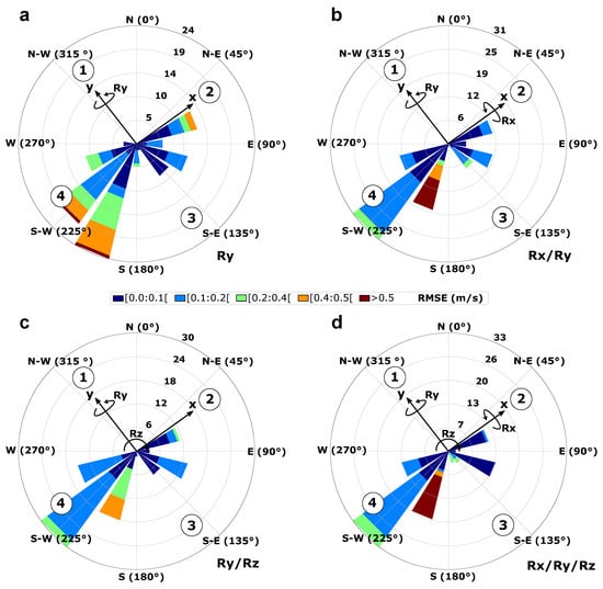 Wind rose illustrating the RMSE of the LOS velocity fluctuations measured by beam 1 at all measurement heights. The four plots correspond to the four sequences involving rotations around the y-axis (Ry)—panel (a)- and three coupling motions (Rx/Ry, Ry/Rz, Rx/Ry/Rz, respectively panels b, c and d), all having the same movement amplitude (5 deg.) and period (6 s). The four numbers displayed indicate the orientation of the lidar’s first four beams. Additionally, two arrows labeled x and y represent the orientation of the hexapod.