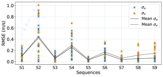 RMSE of the standard deviation of the along-wind and cross-wind velocity components, respectively and , computed for each sequence of the 15 cycles of measurement (Table 3).