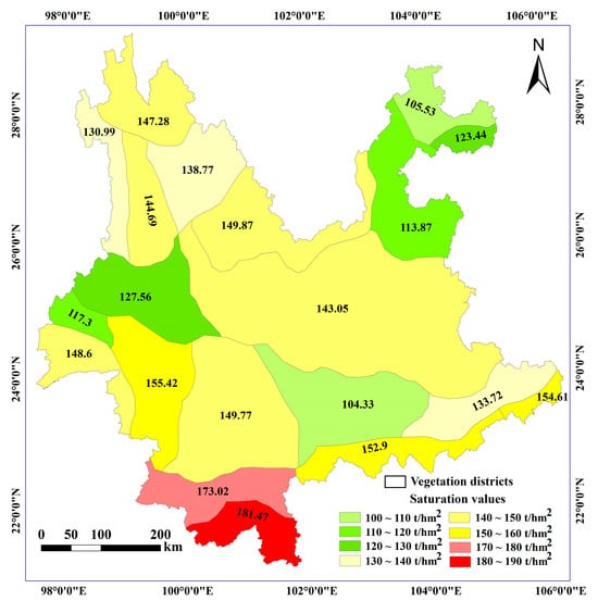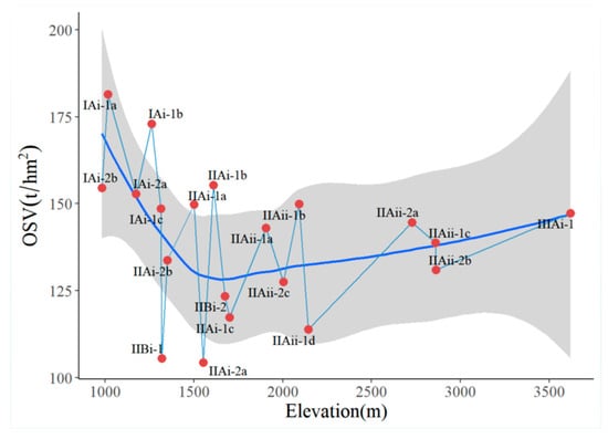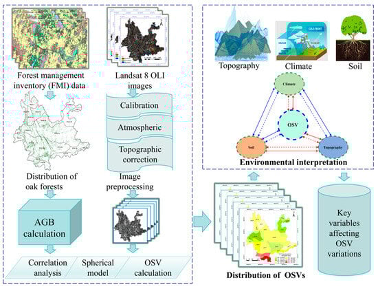 - The red band was used to calculate the OSVs because it had a stronger correlation with oak forest AGBs. The range of OSVs was from 104 t/hm2 to 182 t/hm2. The OSVs were lower in northeastern and western Yunnan, and the highest OSVs were in southern Yunnan.